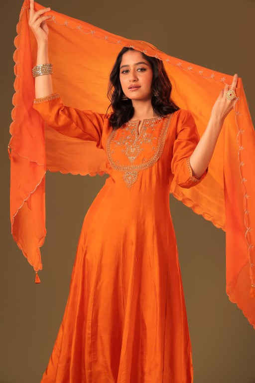 Pink Mal Chandheri A-Line Kurti Set – Anarkali Style with Hand Embroidery