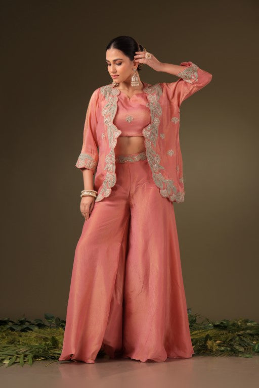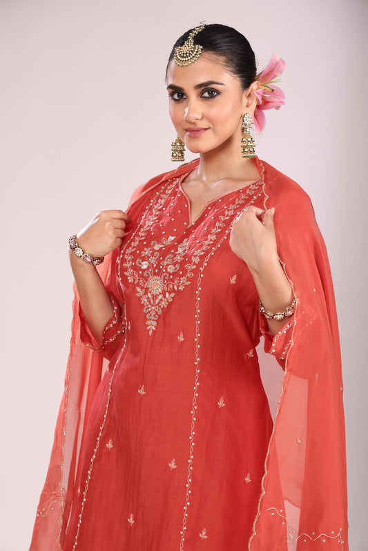 3 Pc Kurti Sharrara Dupatta Set – Mal Chandheri with Hand Embroidery