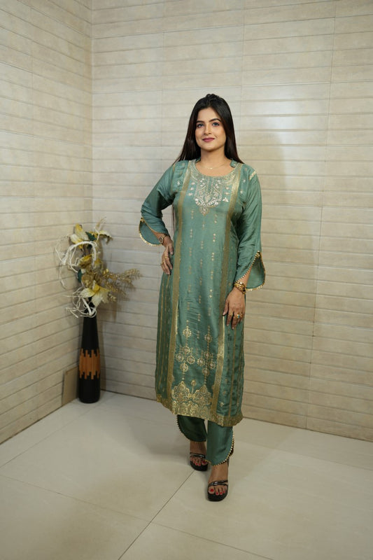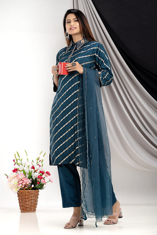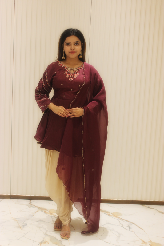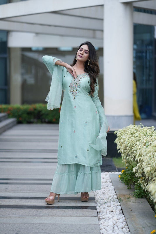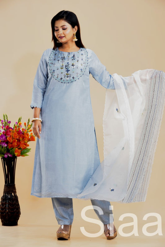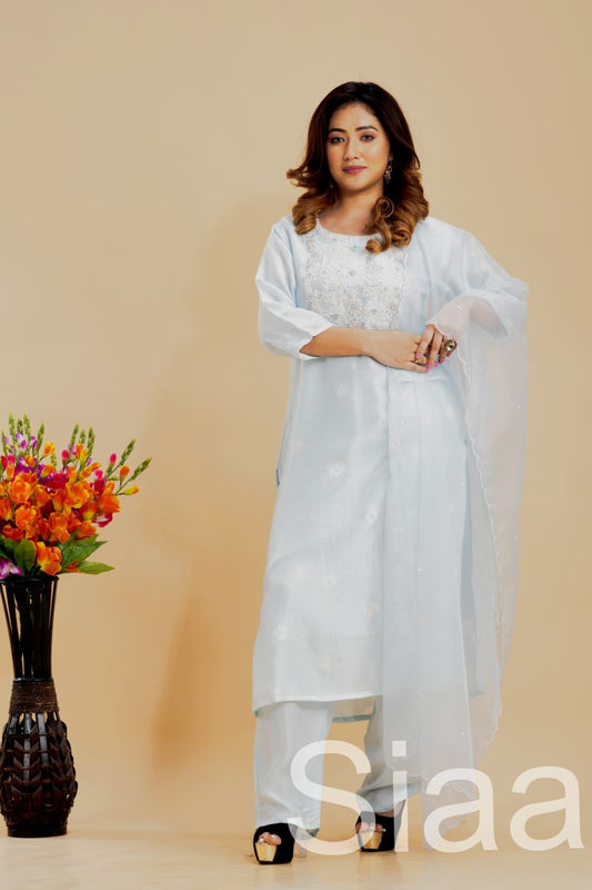 Organza Silk Kurti Set with Pant & Dupatta β Hand Embroidery, 3 Pc