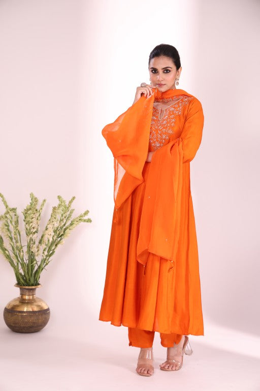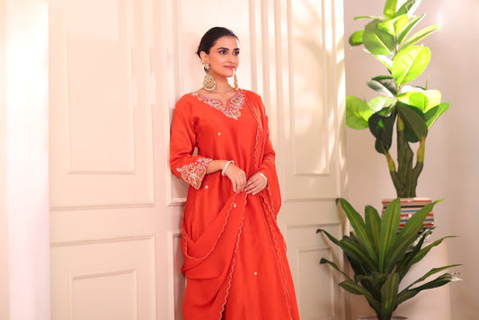 Rust Mal Chandheri A-Line Kurti โ€“ Hand Embroidery, Contemporary Ethnic Wear