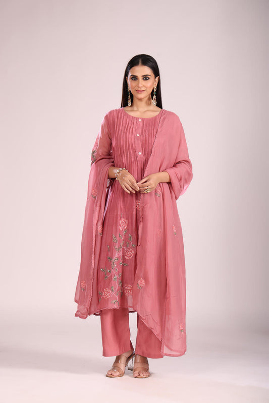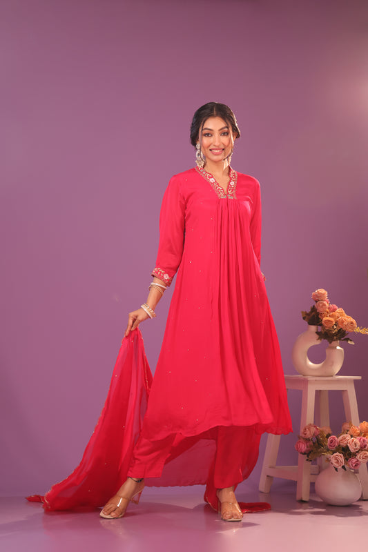 Pink Mal Chandheri A-Line Kurti Set โ€“ Anarkali Style with Hand Embroidery