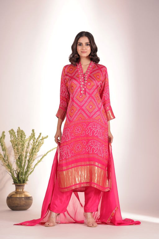 Bandhej Printed Silk Kurti Set with Sharara & Dupatta โ Hand Embroidery, 3 Pc