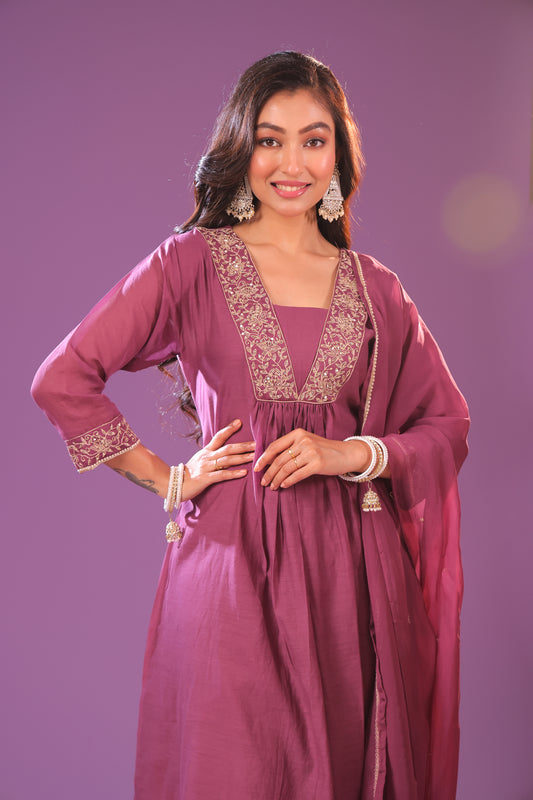 Lavender Cotton A-Line Kurti โ Hand Embroidery, Anarkali Style