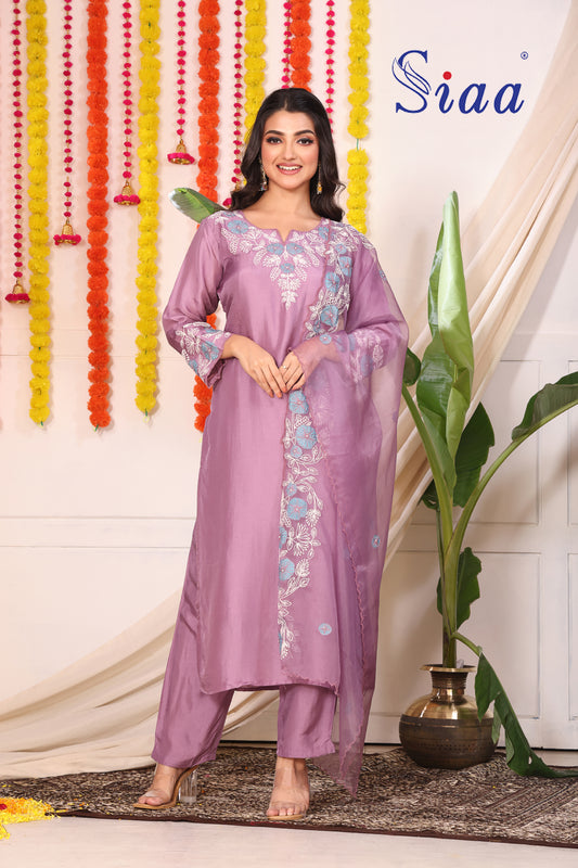 Onion 3 Pc Kurti Pant Dupatta Set โ Organza Silk with Lucknowi Hand Embroidery