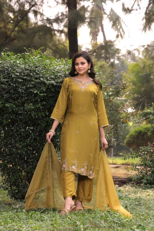 Mustard Organza Kurti Set with Pant & Dupatta โ Printed, Hand Embroidery