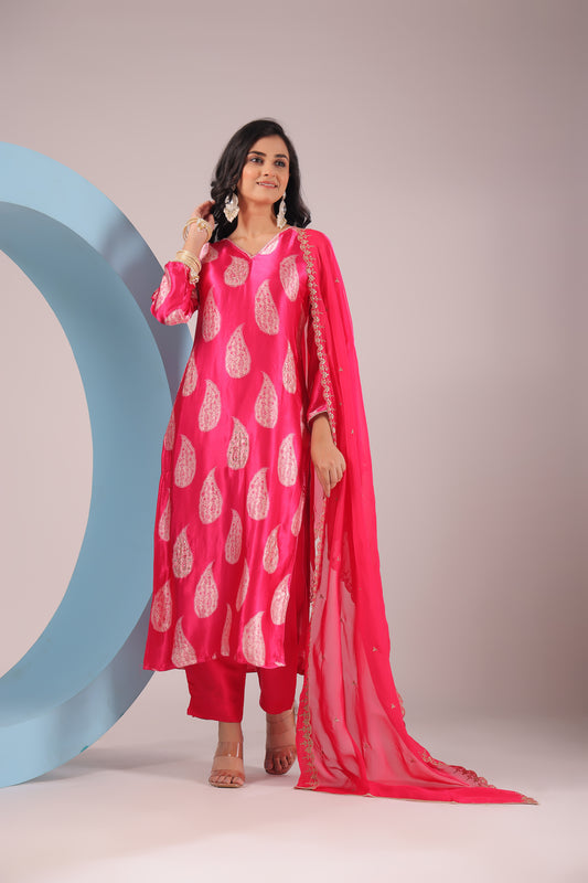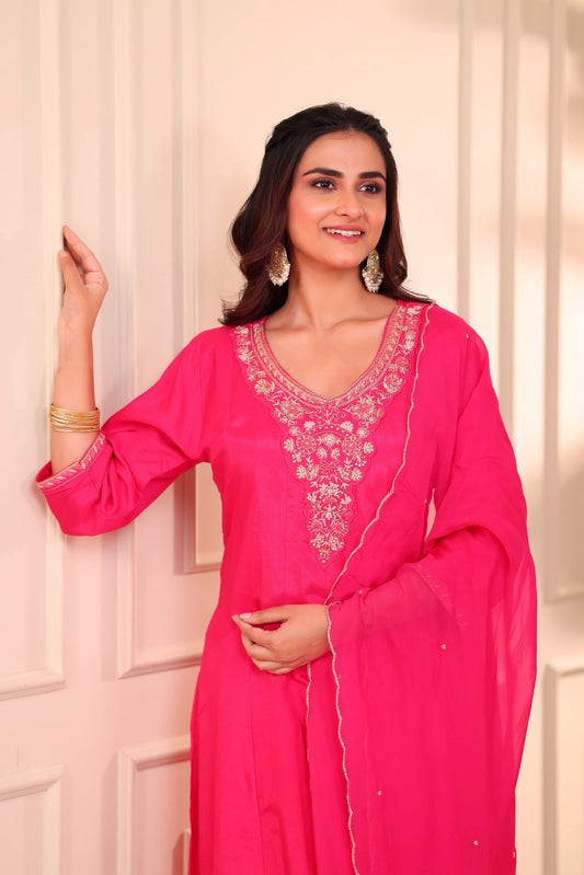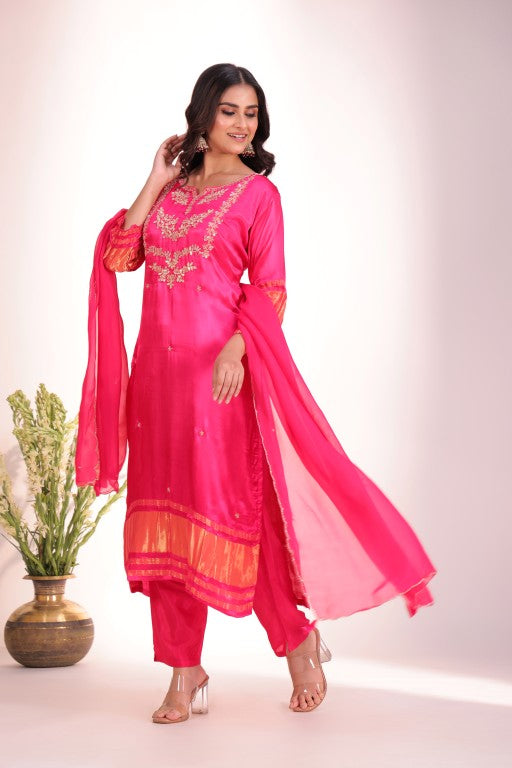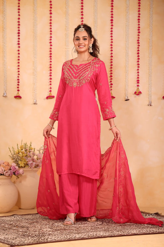 Orange Organza Kurti Set with Pant & Dupatta โ Printed, Hand Embroidery, 3 Pc