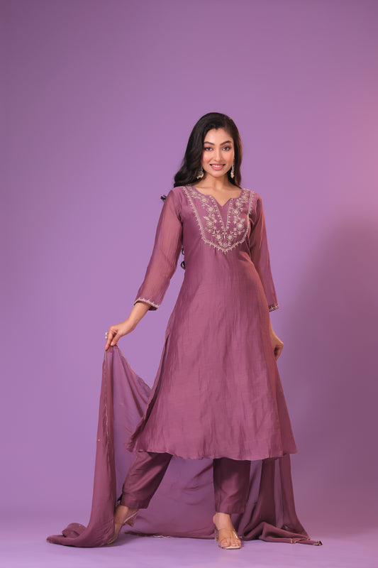 Mauve Organza Kurti Set with Pant & Dupatta โ Printed, Hand Embroidery, 3 Pc