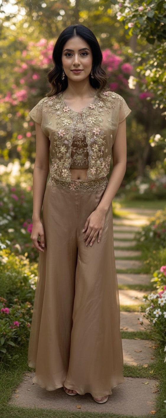 Step into ethereal elegance with this three-piece fusion set crafted from luxurious Habutai Organza. The ensemble features flowy wide-leg trousers with an intricately embellished waistband, paired with a matching inner crop top. The look is elevated by a sheer, short-sleeved jacket adorned with delicate floral embroidery. Perfect for daytime festivities, this outfit is available in two stunning shades: Pink and Chikoo.