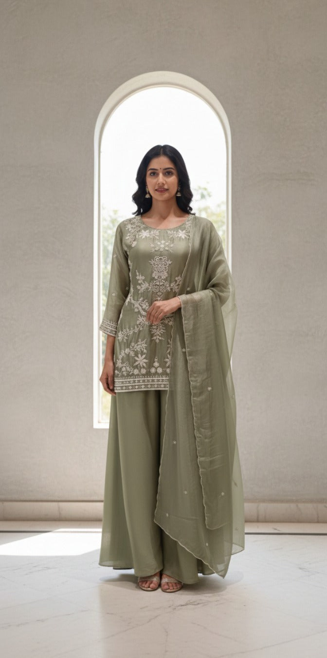This Beige and Green Sharrara Set is a sophisticated festive ensemble crafted from crisp, shimmering Organza. The look features a kurta with detailed intricate white-thread embroidery and Zari work, paired with voluminous, flared bottoms that provide a dramatic, airy silhouette. Finished with a matching dupatta, this outfit perfectly balances soft pastel tones with a structured, high-fashion aesthetic.