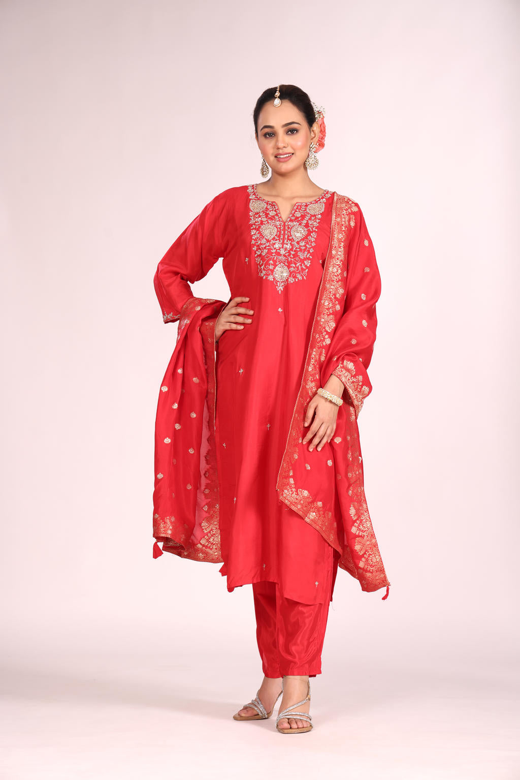 Banarasi Silk Kurti Set with Pant & Dupatta – Hand Embroidery, 3 Pc