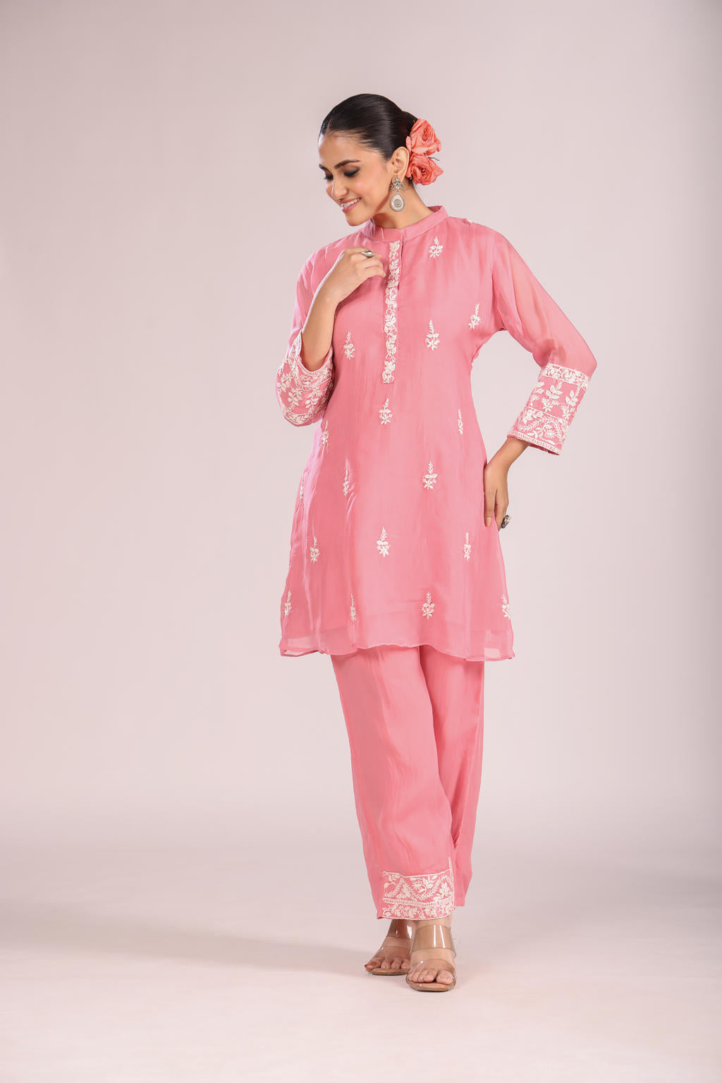 Step into elegance with our Organza Cord Set, designed in chic Onion and Peach tones. This 2-piece Indo-Western ensemble includes a kurti and pant, adorned with subtle hand embroidery, making it perfect for festive evenings, cocktail gatherings, or stylish ethnic wear.