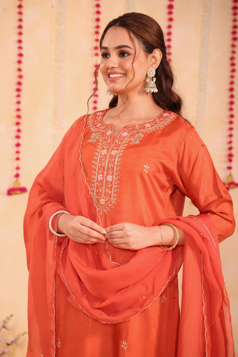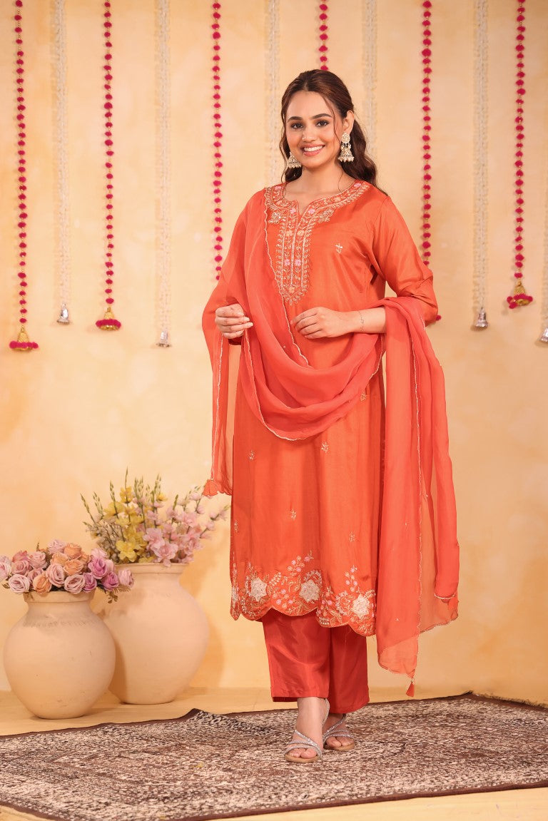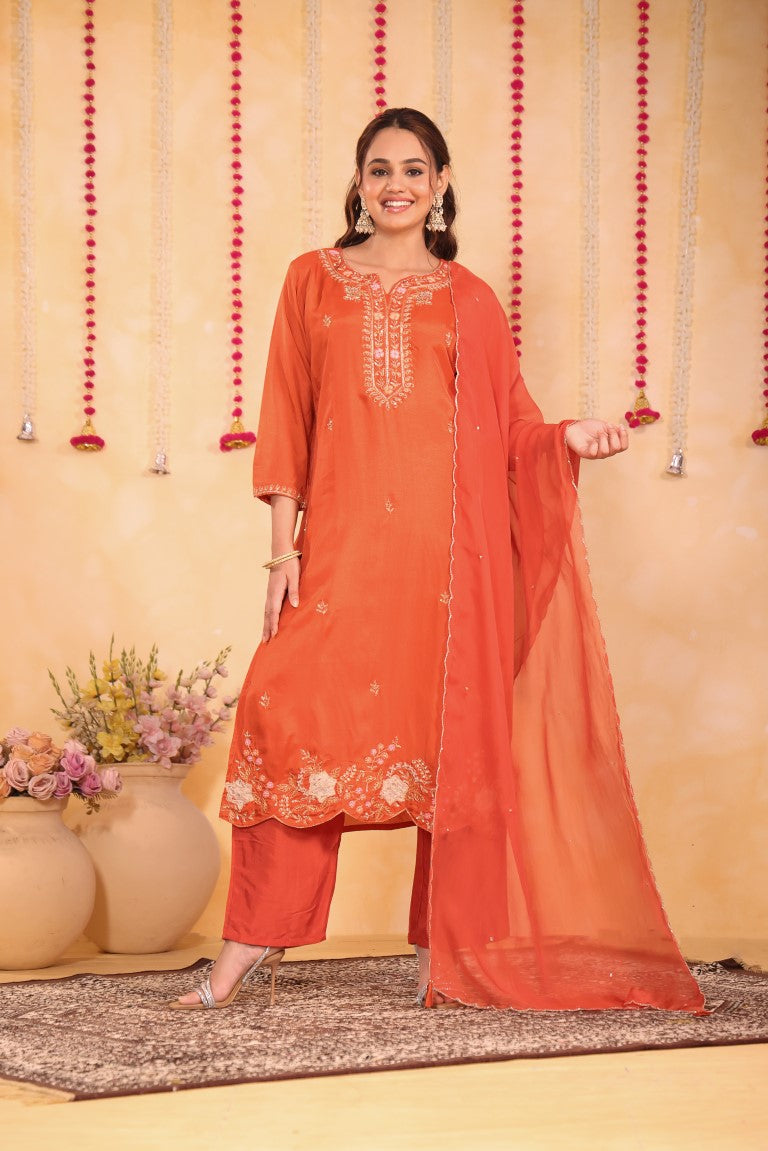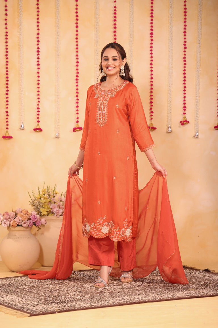 This elegant 3-piece set includes a kurti, pant, and dupatta, crafted with meticulous hand embroidery that highlights traditional ethnic artistry. Designed for comfort and style, the ensemble offers a refined look suitable for various occasions. The coordinated pieces ensure a cohesive outfit that reflects cultural heritage while providing ease of wear. Ideal for those seeking authentic ethnic clothing with expert craftsmanship.