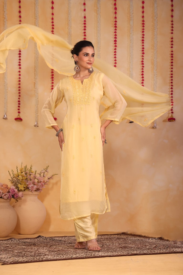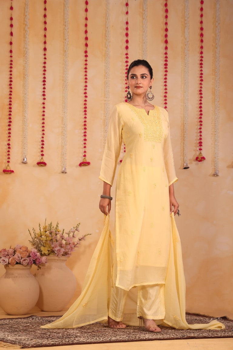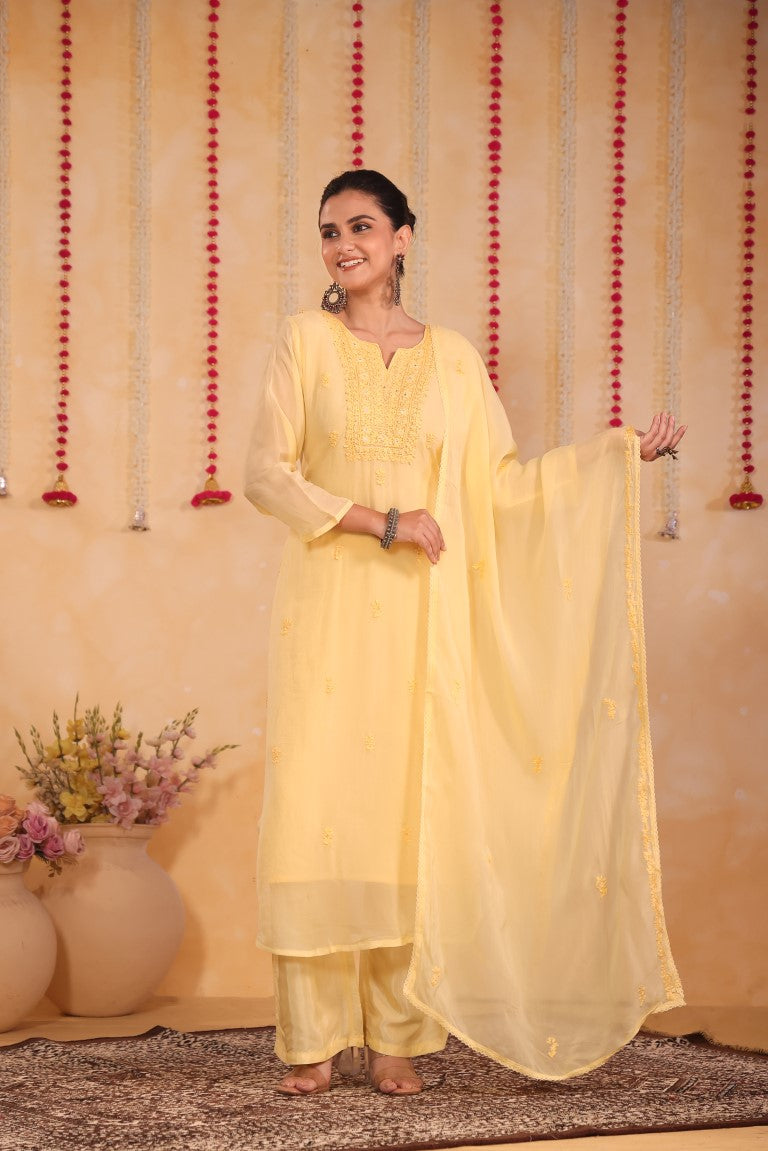 This elegant 3-piece set includes a kurti, pant, and dupatta, crafted to blend traditional charm with modern comfort. Featuring delicate hand embroidery, it offers a refined ethnic look perfect for casual wear or festive occasions. The coordinated pieces ensure a cohesive outfit that is both stylish and versatile, making it an essential addition to your wardrobe.