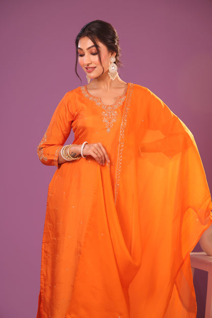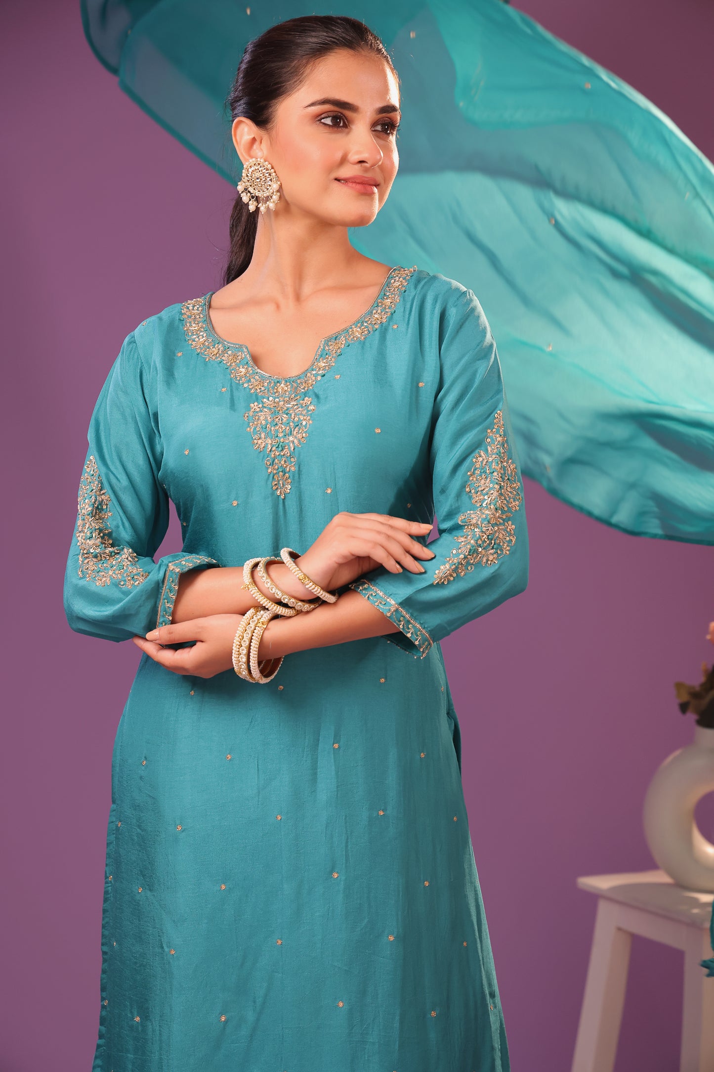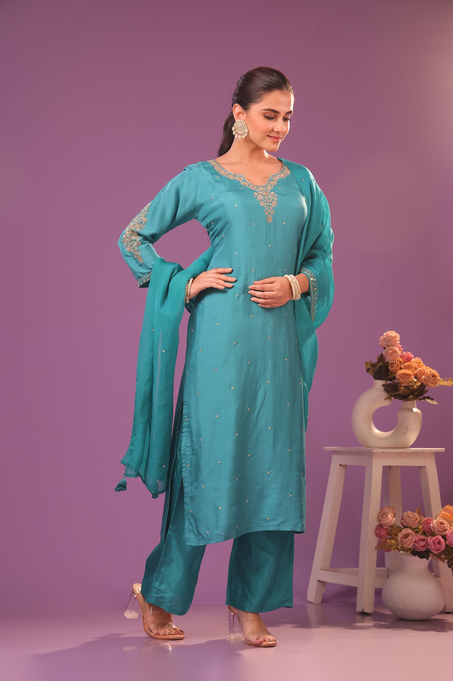 This ethnic clothing set, containing a kurti, pant, and dupatta, showcases traditional hand embroidery. Elevate your wardrobe with this stylish and versatile 3-piece set, perfect for any occasion. Enjoy the comfort and elegance of this timeless ensemble.