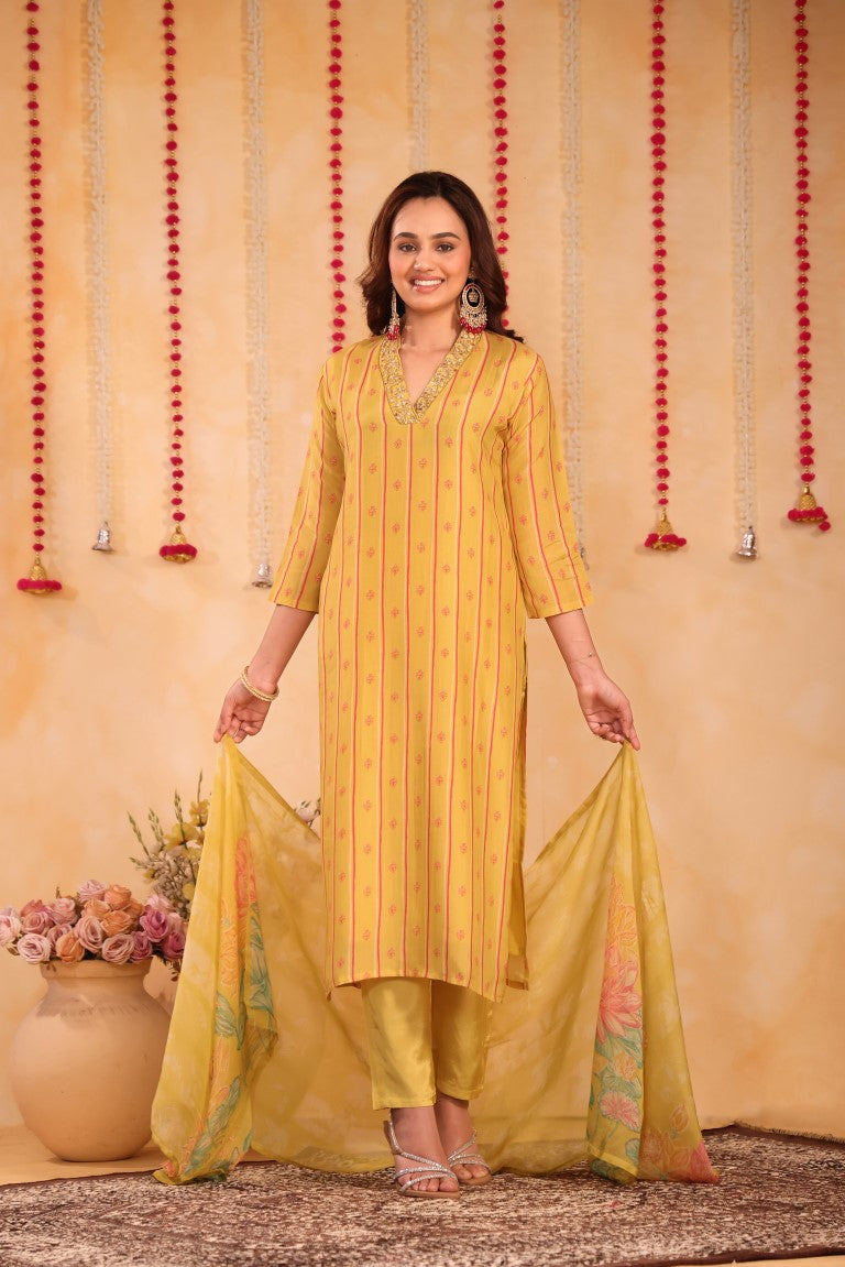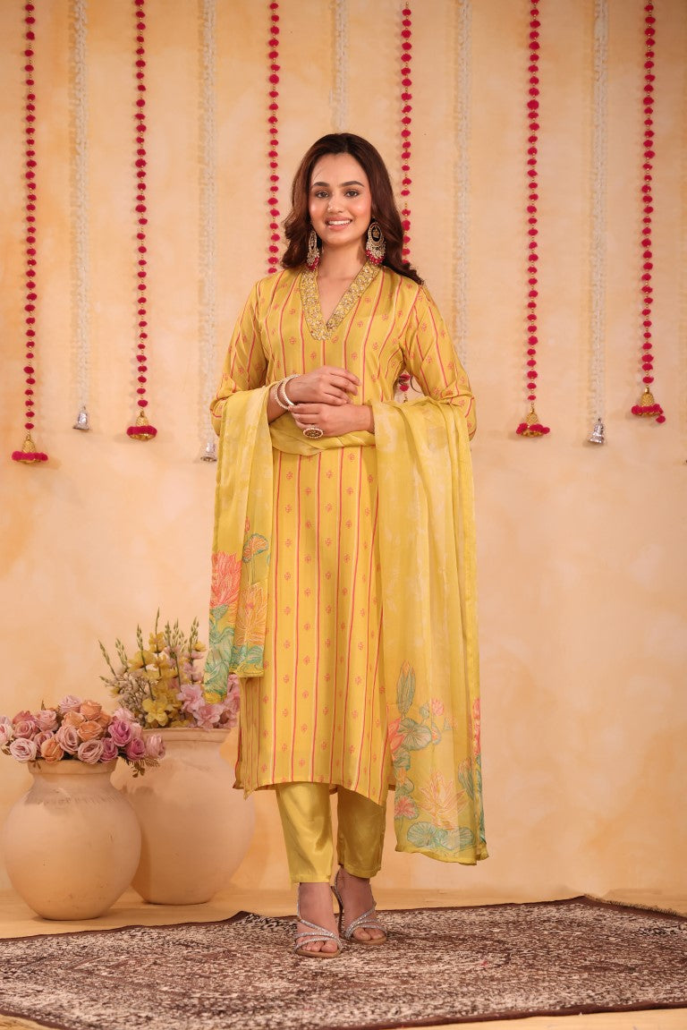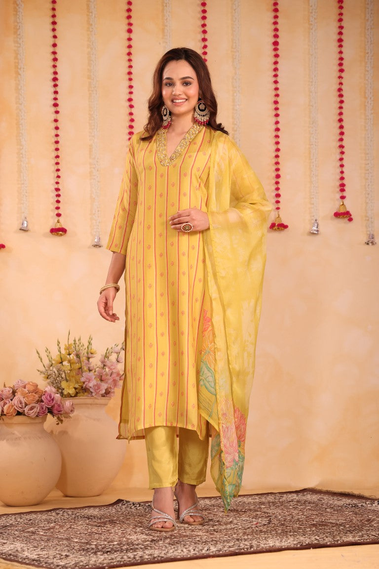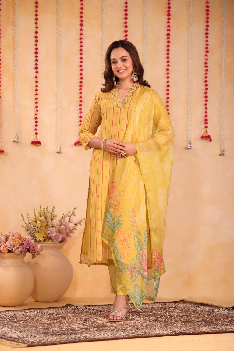 This elegant 3-piece set includes a kurti, pant, and dupatta crafted from premium silk fabric. Featuring intricate hand embroidery and vibrant prints, it exemplifies refined ethnic wear. Designed for comfort and style, this kurta set is perfect for festive occasions and traditional gatherings, offering a sophisticated blend of craftsmanship and contemporary appeal.