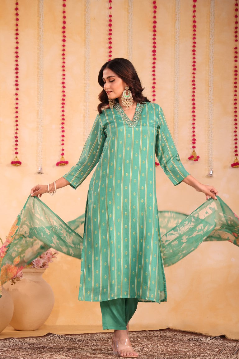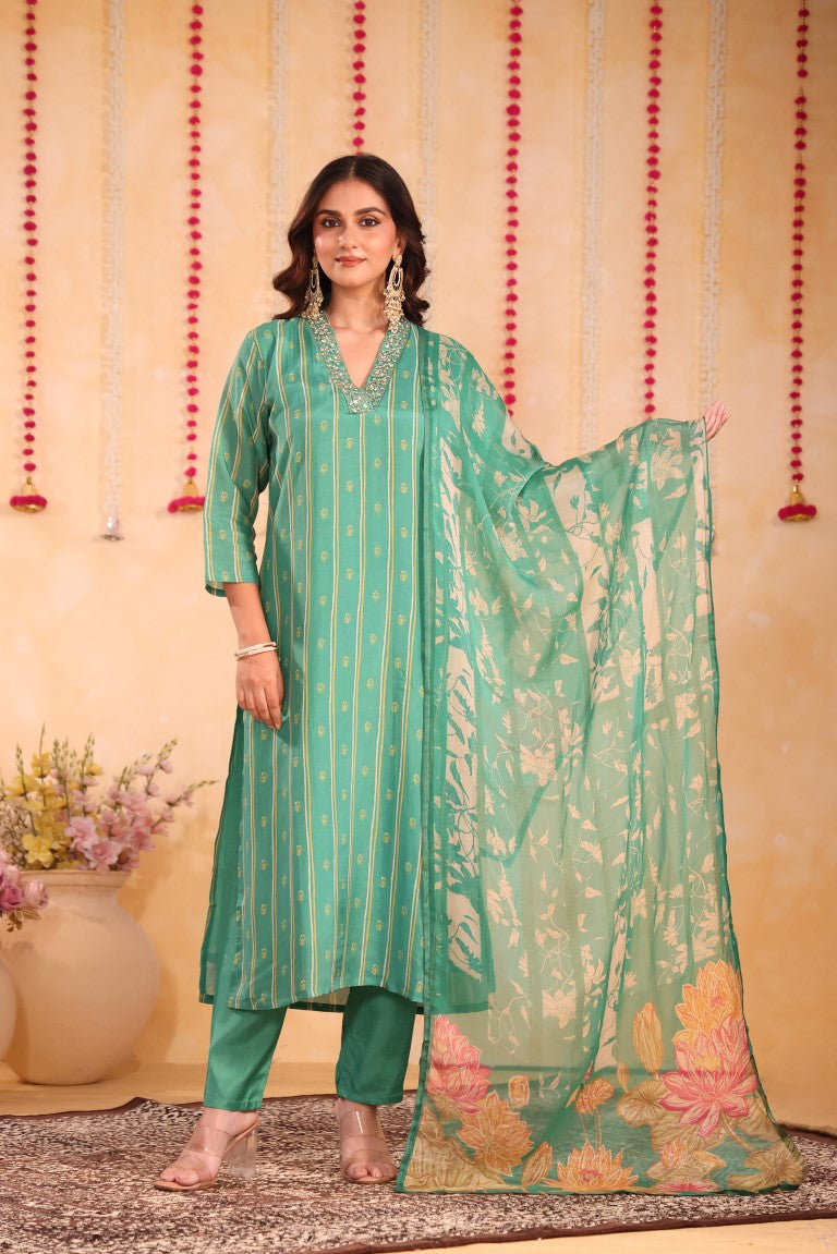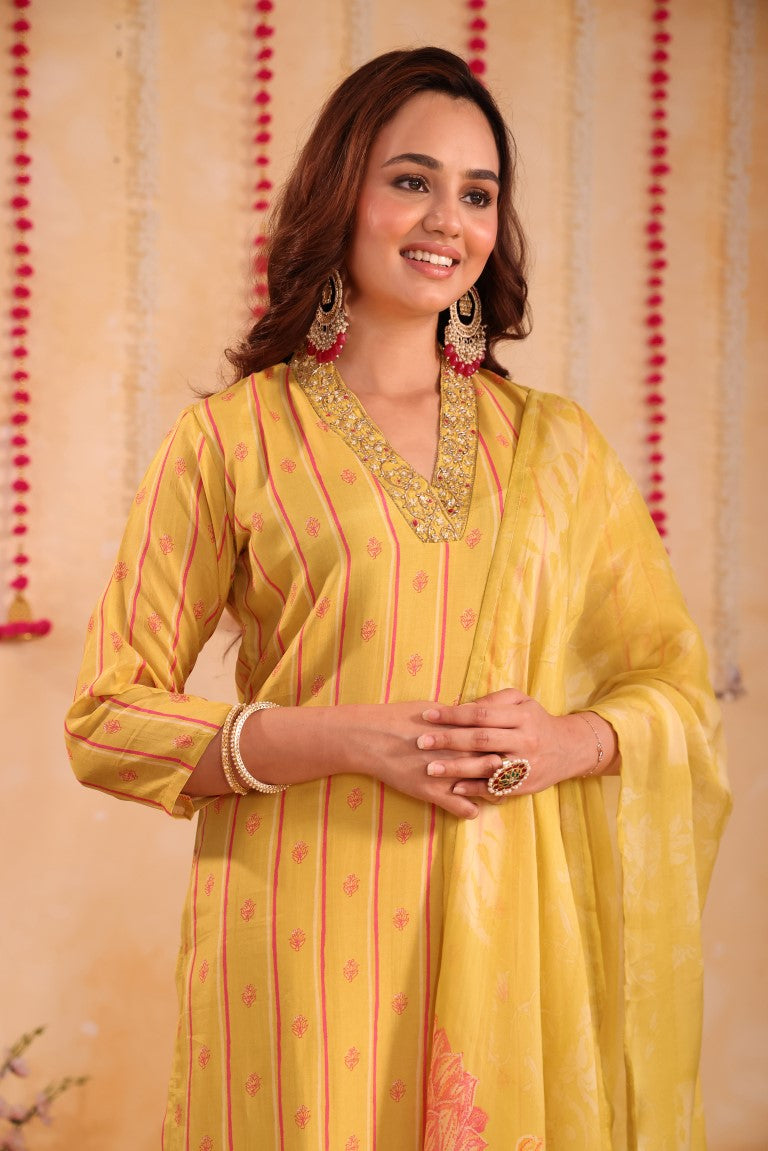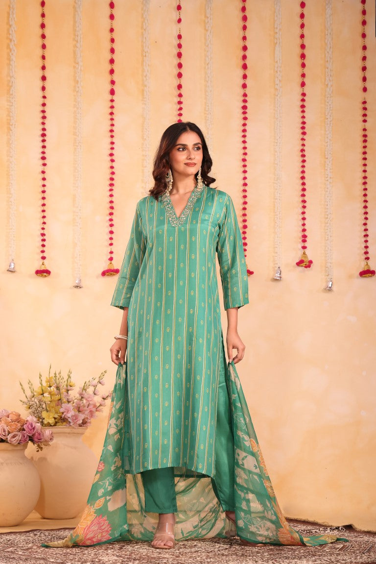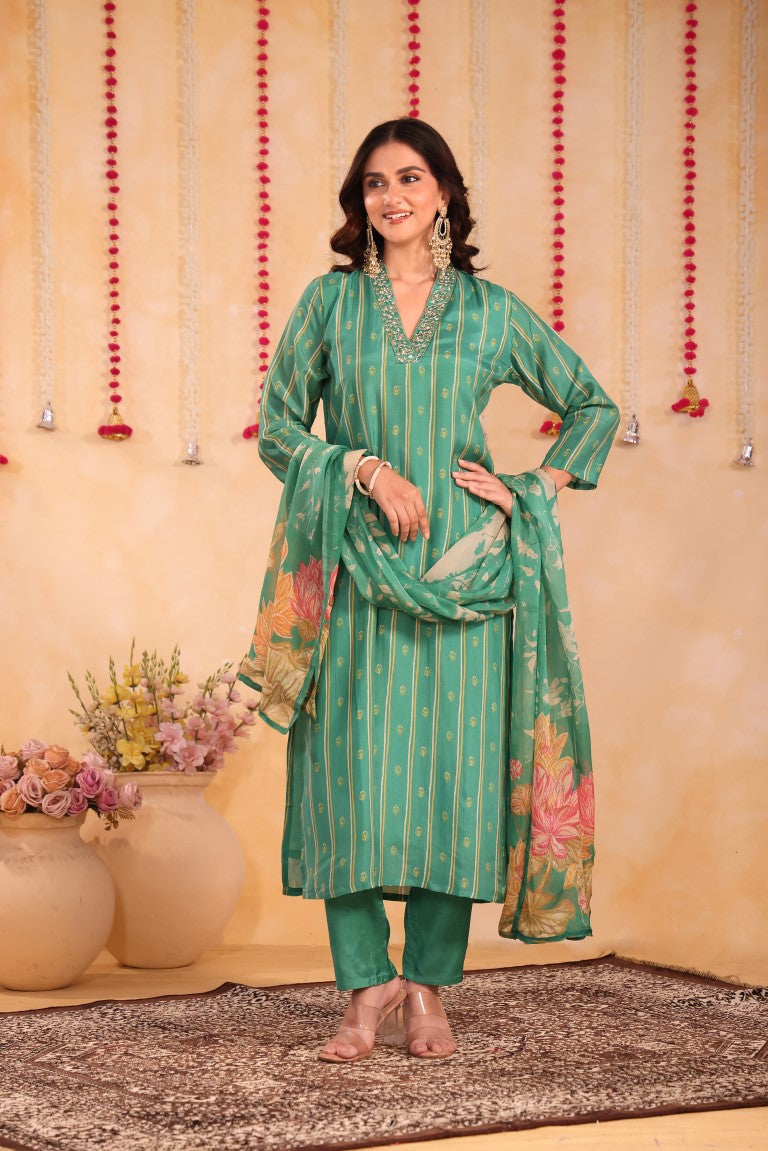 This elegant 3-piece set includes a kurti, pant, and dupatta crafted from premium silk fabric. Featuring intricate hand embroidery and vibrant prints, it exemplifies refined ethnic wear. Designed for comfort and style, this kurta set is perfect for festive occasions and traditional gatherings, offering a sophisticated blend of craftsmanship and contemporary appeal.