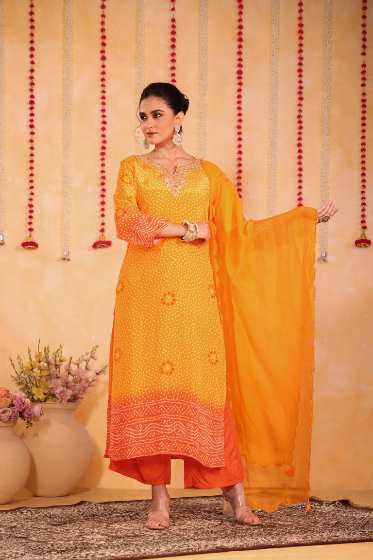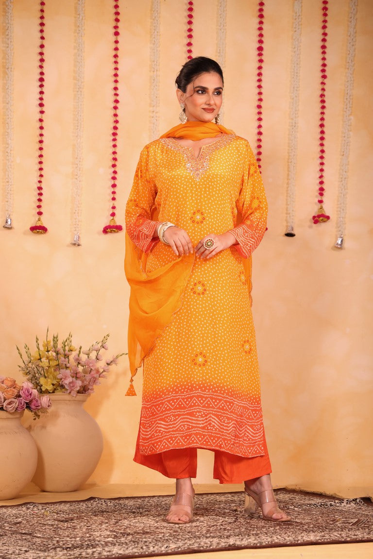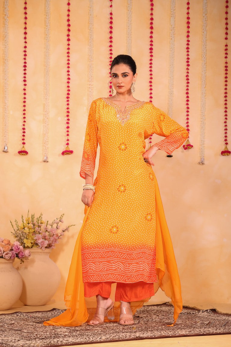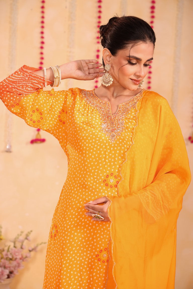 Expertly crafted with hand embroidery, this signature Kurti set is a must-have for your ethnic wear collection. Made from luxurious silk and featuring a traditional Bandhej design, this set includes a Kurti, pant, and dupatta. Elevate your style and embrace the cultural heritage with this 3-piece ensemble.