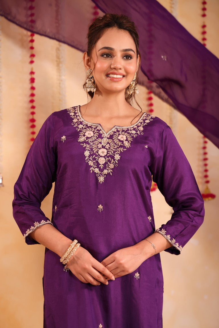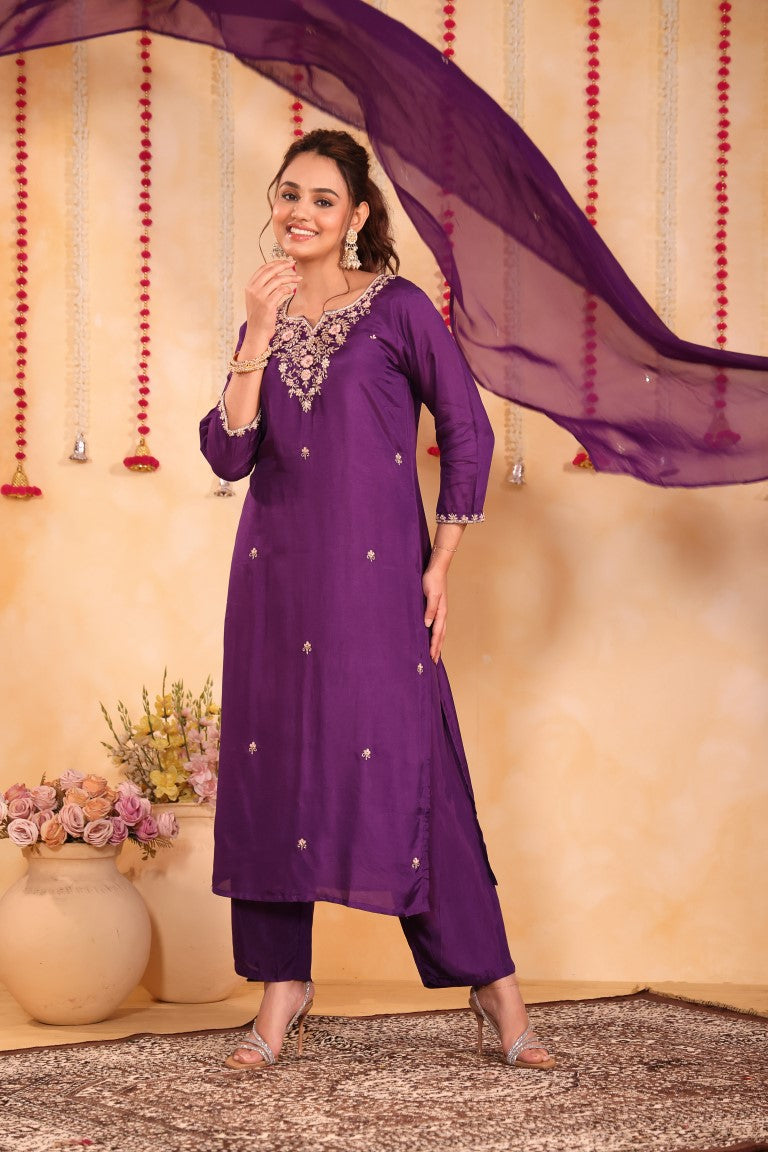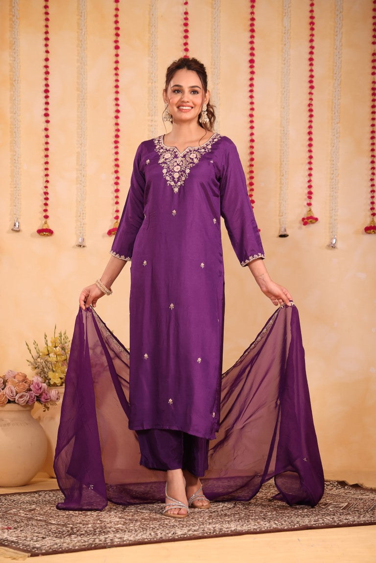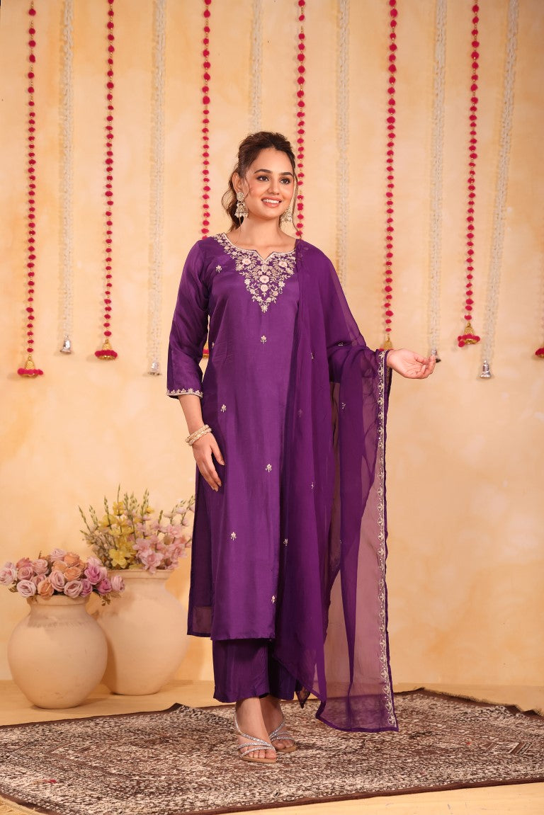 This elegant 3-piece set includes a kurti, pant, and dupatta crafted from premium silk fabric. Featuring intricate hand embroidery, it exemplifies refined ethnic craftsmanship. Perfect for special occasions, this kurta set combines traditional artistry with contemporary style for a sophisticated look.