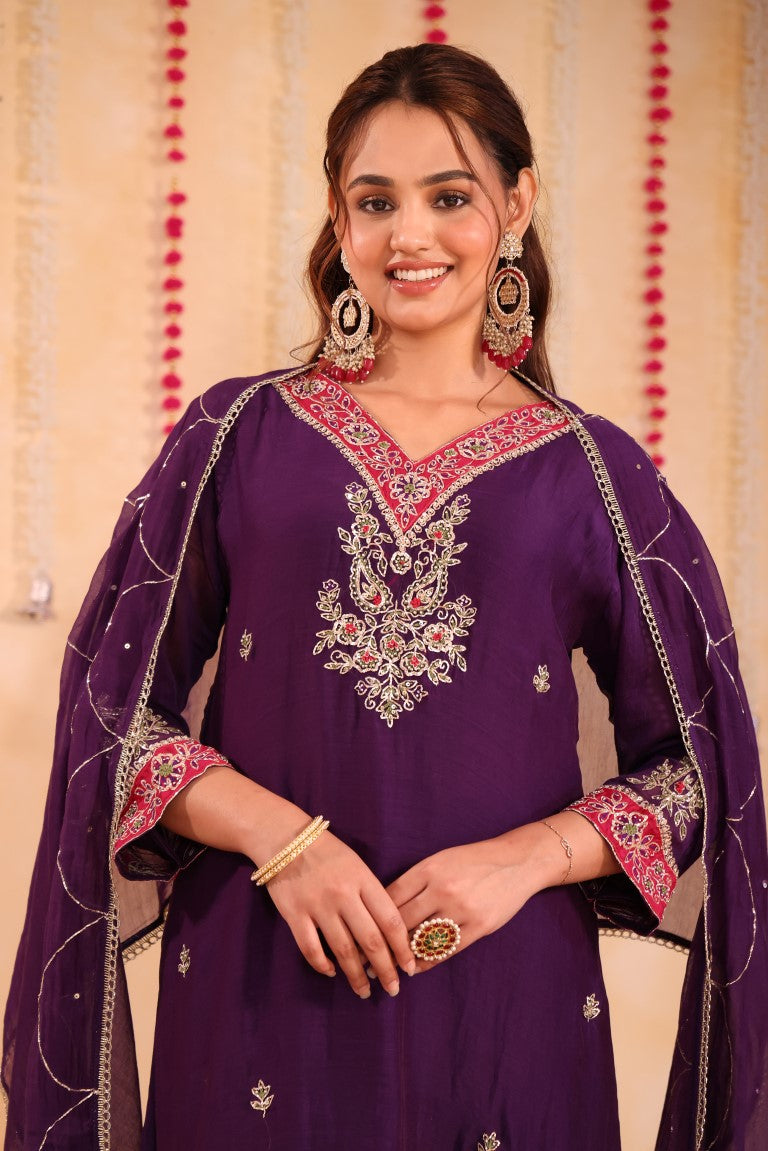 This elegant 3-piece set includes a kurti, pant, and dupatta, crafted with fine hand embroidery that highlights traditional ethnic artistry. The kurti features an A-line silhouette inspired by Anarkali styles, designed to offer both comfort and graceful movement. Paired with tailored pants and a matching dupatta, this ensemble is ideal for festive occasions and cultural events, combining classic charm with contemporary wearability.